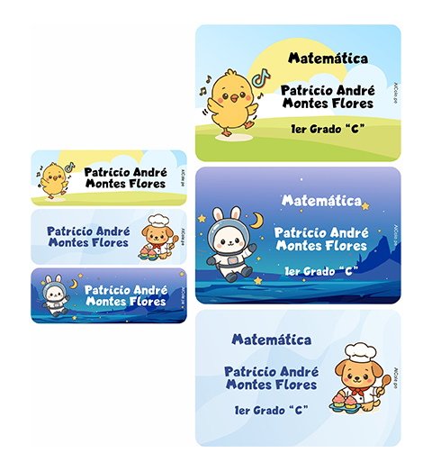 Vienen en diferentes formas y diseños. Cada etiqueta es personalizada con el nombre de tu niño, el grado y el curso.