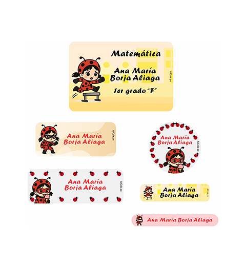 Vienen en diferentes formas y diseños. Cada etiqueta es personalizada con el nombre de tu niño, el grado y el curso.