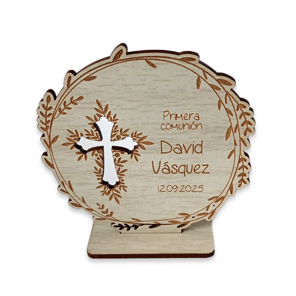 Diseñado como un adorno decorativo para mesas o escritorios, cuenta con un pedestal como base que le da estabilidad y presencia, convirtiéndolo en un recuerdo que puede acompañar por muchos años. Su estilo moderno y elegante lo hace ideal para eventos como Bautizo, Primera Comunión y Confirmación.